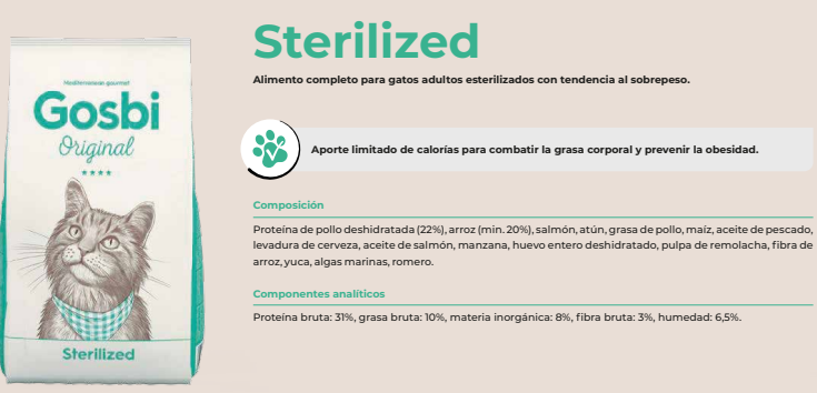 Alimento adaptado al mayor apetito y menor actividad que caracteriza a los gatos esterilizados, con todos los requerimientos nutritivos necesarios para una correcta alimentación.